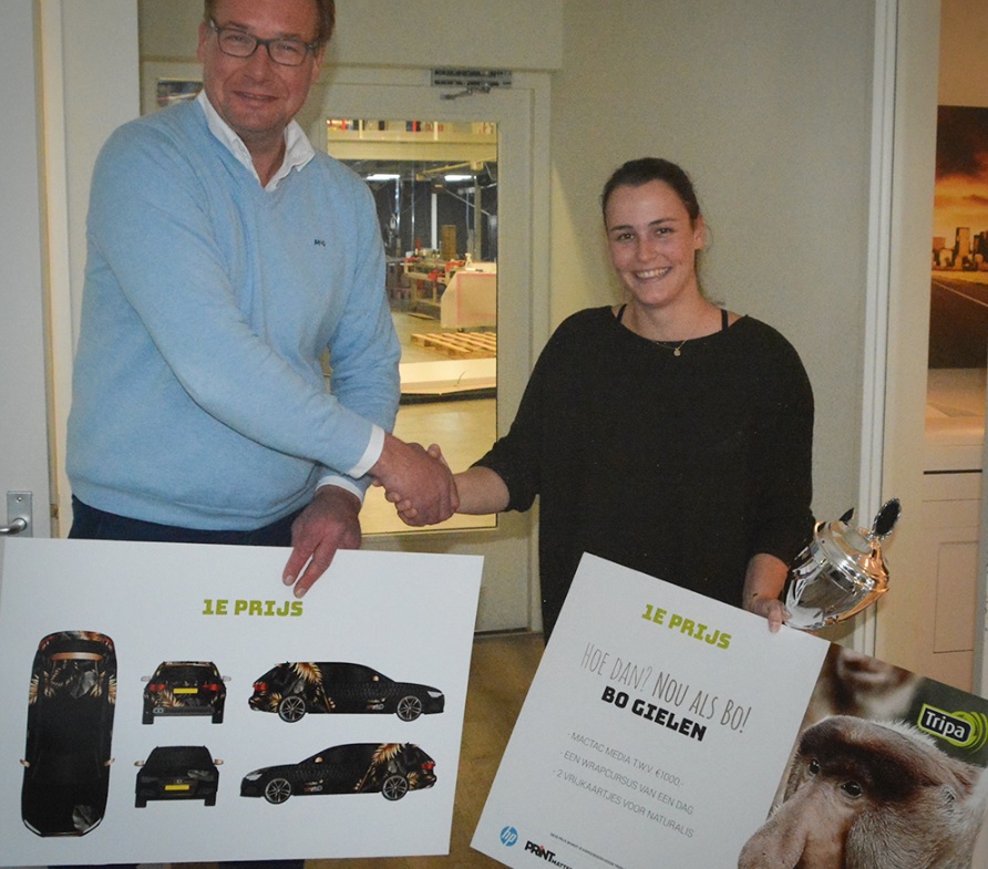 Het carwrap-ontwerp van winnares Bo Gielen kreeg in het juryrapport de volgende omschrijving mee: er is echt slim over het ontwerp nagedacht, er zijn verschillende materiaalkeuzes verwerkt (als opgegeven in de opdracht), de logo’s zijn op de juiste manier verwerkt, de aangegeven lijntekening is op eigen initiatief aangepast met andere velgen en het geheel verbeeldt een originele benadering van het onderwerp natuur. Zij ontving de prijs en een mooie beker uit handen van Tripa-directeur Leon Arendsen (op de foto links).